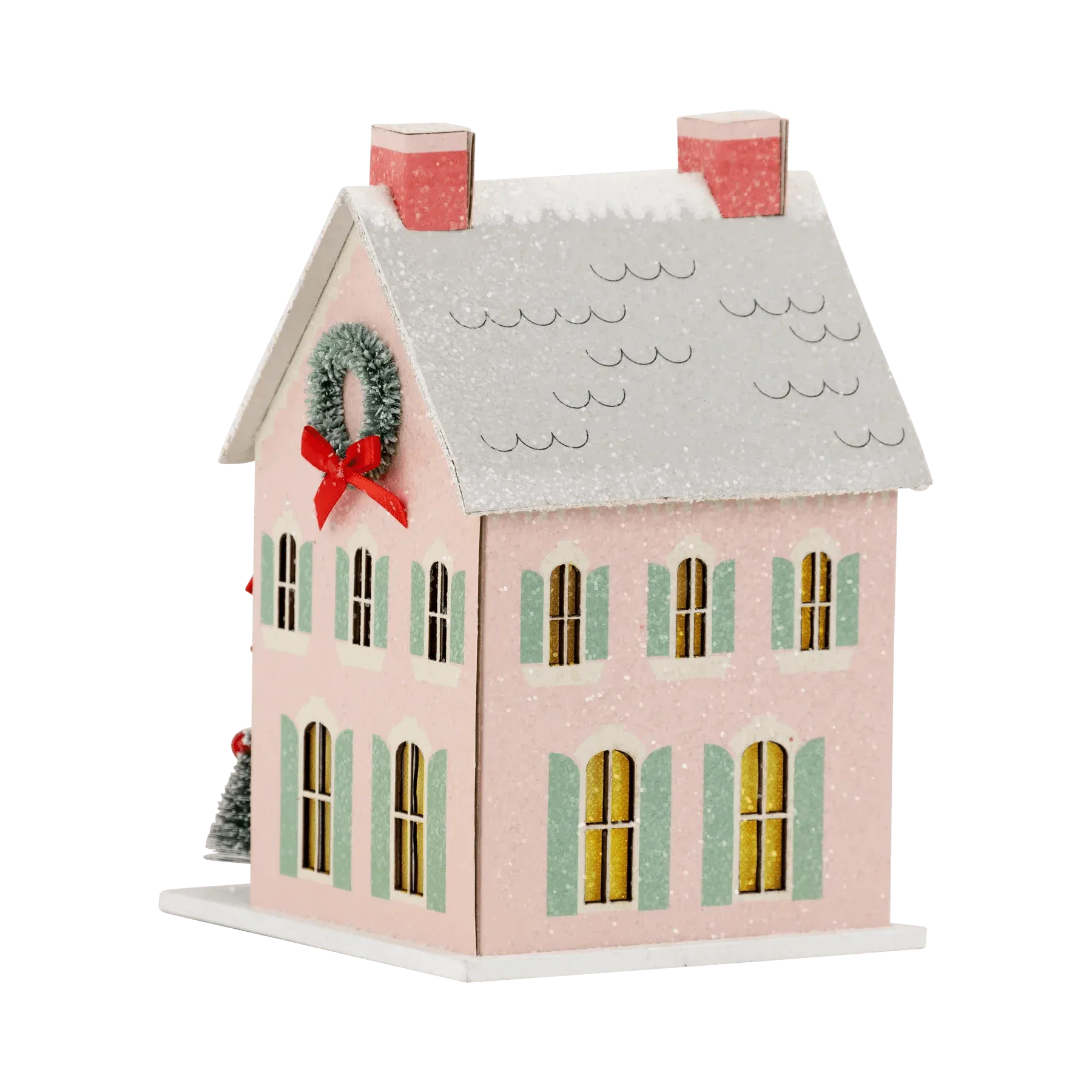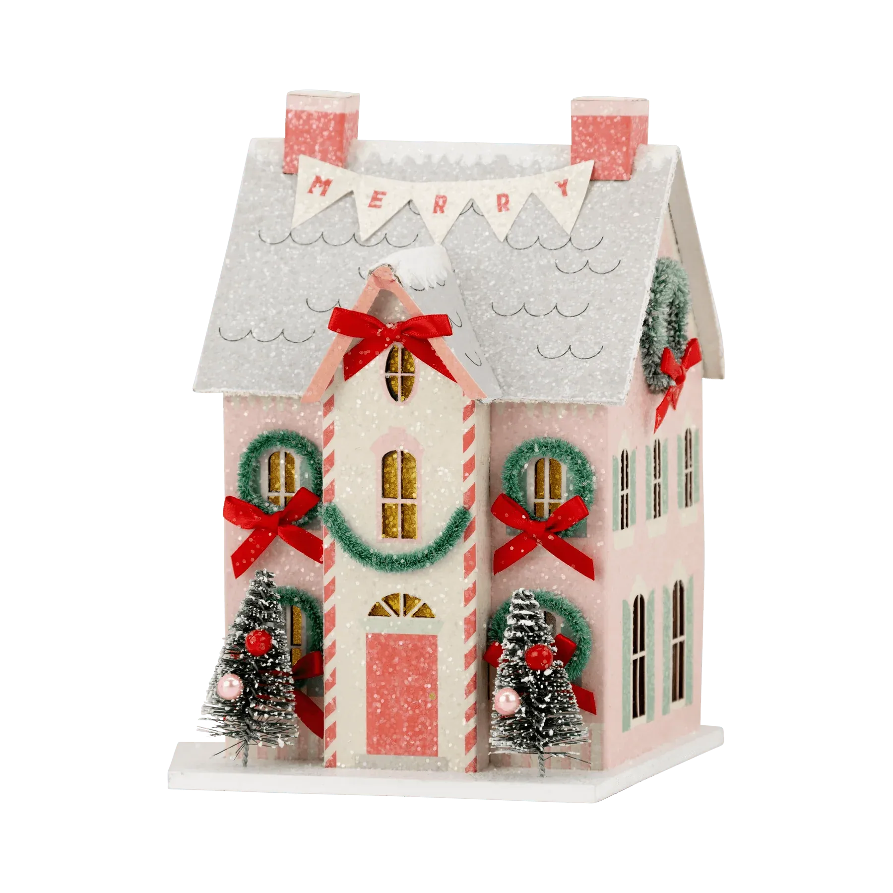Add some sparkle to your holiday decor with our Christmas Village Merry House. Made of heavyweight paper with glitter accents, this charming village house will bring holiday cheer to any room. Perfect for creating a festive atmosphere and capturing the magic of the season.