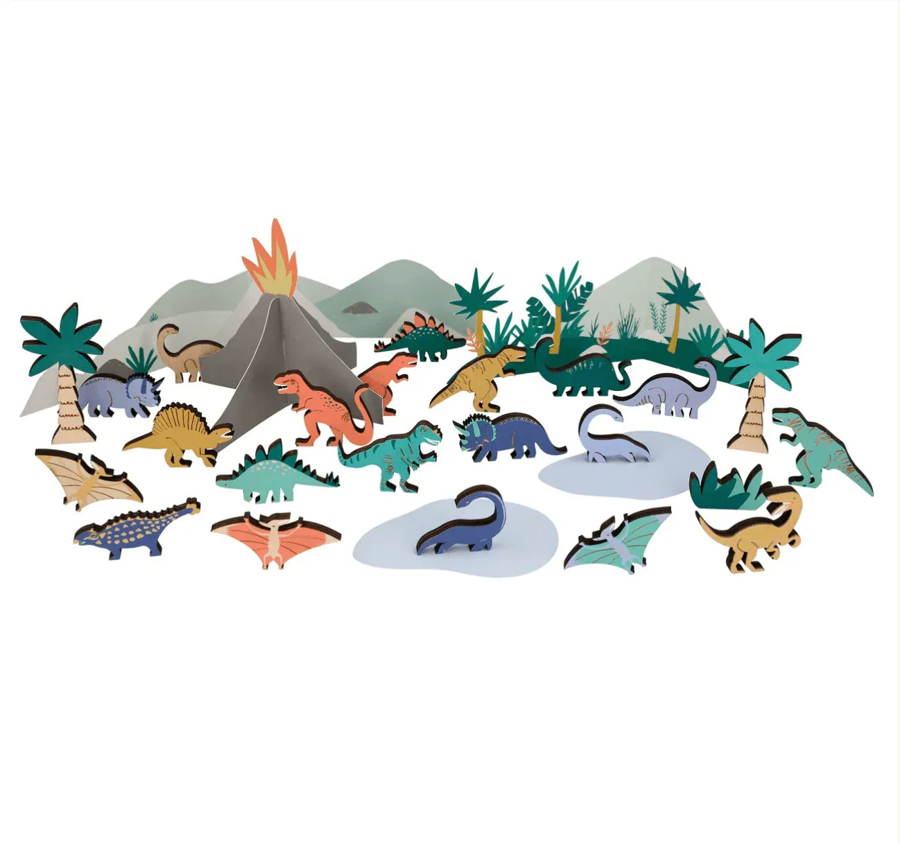 Contains 20 wooden dinosaurs and 3 wooden foliage pieces