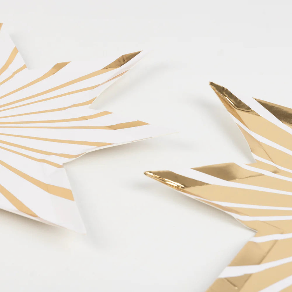 These special star paper plates will look amazing on your festive party table (and look splendid as decorations too!). They are cleverly crafted with two designs that mirror each other - one white with gold foil, and the other gold foil with white.