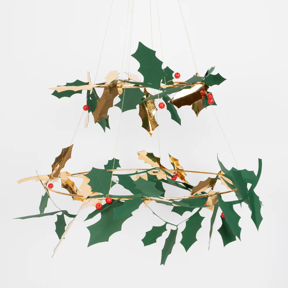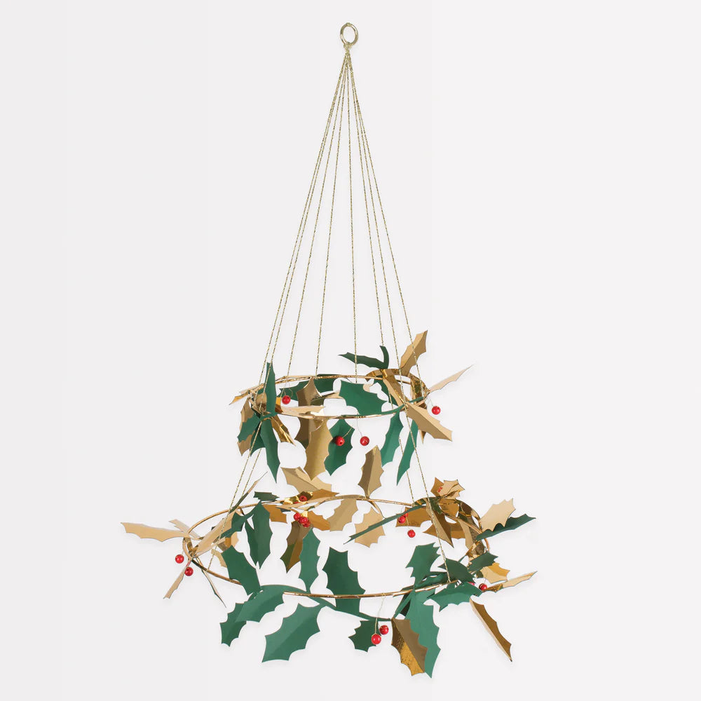 Make your home look instantly festive with this beautiful paper, wood and metal chandelier. Simply hang it in your porch or doorway, or from the ceiling, for a statement look. It blends a traditional holly design with lots of shiny gold foil for a stylish effect. And, unlike real foliage, you can reuse it year after year.