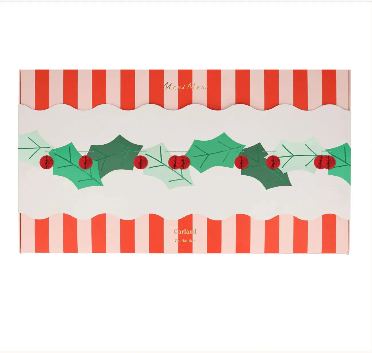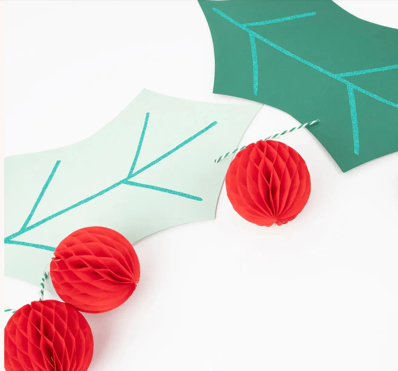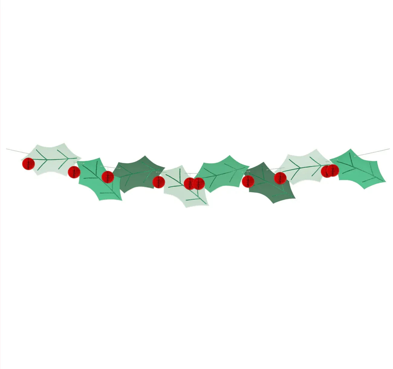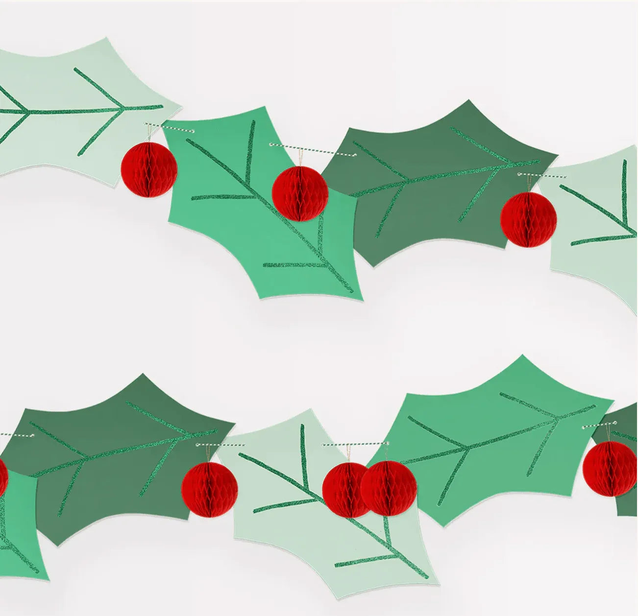Deck the halls with boughs of holly! This beautiful Christmas garland, with 3D honeycomb holly berries and glittery leaves, is perfect to place in the hallway, in the doorway, on the walls or stairs, draped on the mantel or on your party table.