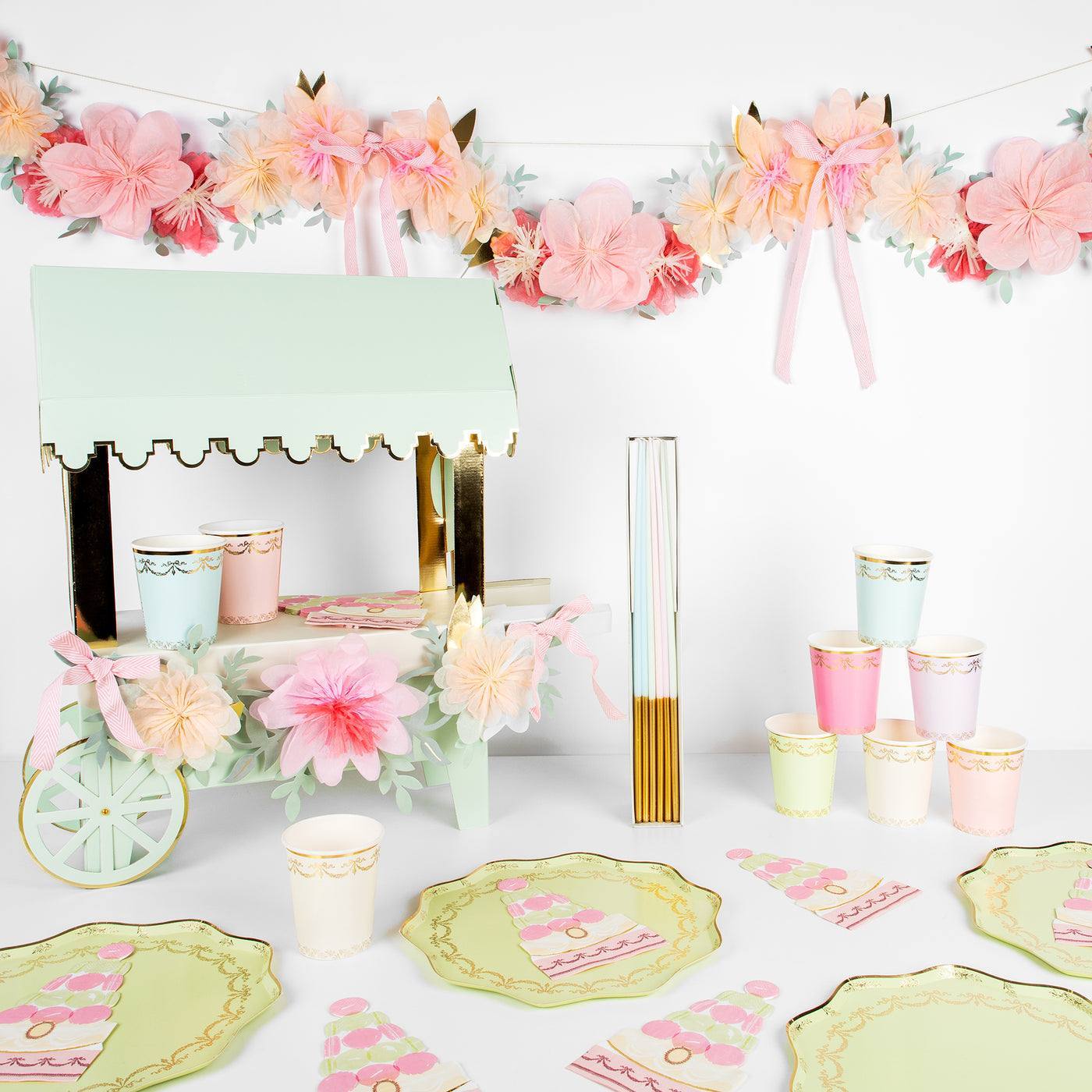 We've collaborated with Parisian patisserie and macaron-making pros Ladurée on a sumptuous tea party range. In this set you will receive pastel plates, cups and napkins; a floral garland to add elegance to your party table or walls; tapered candles; and a macaron cart centerpiece to wow your guests.