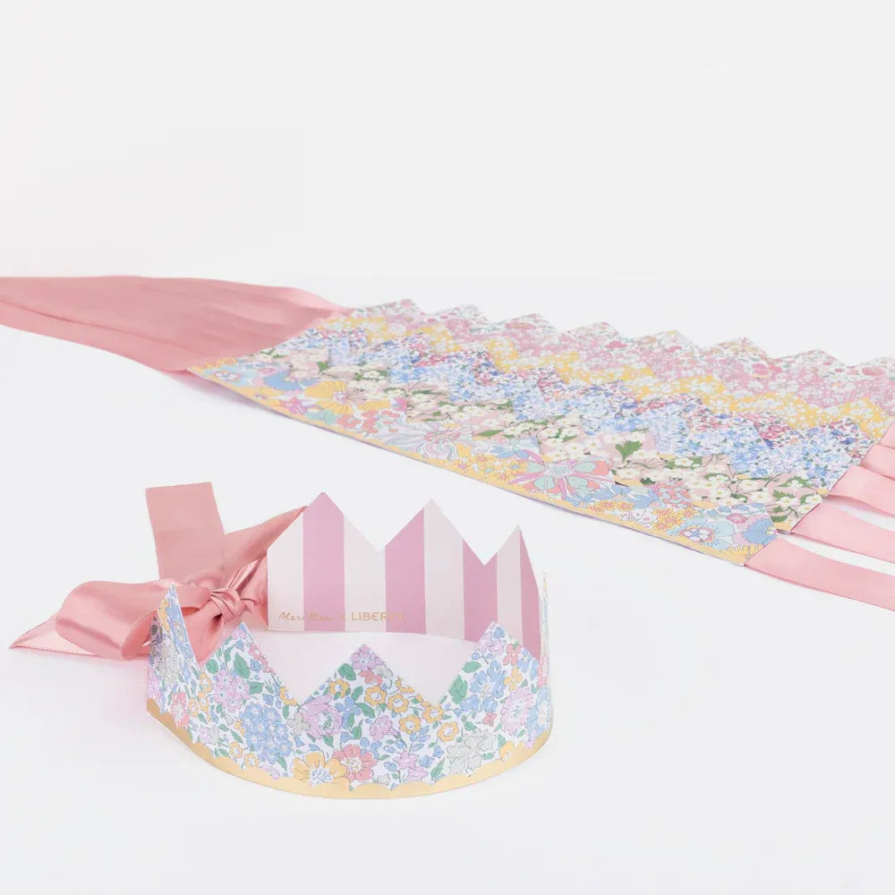 • 8 Paper party crowns, each with a different floral Liberty print design