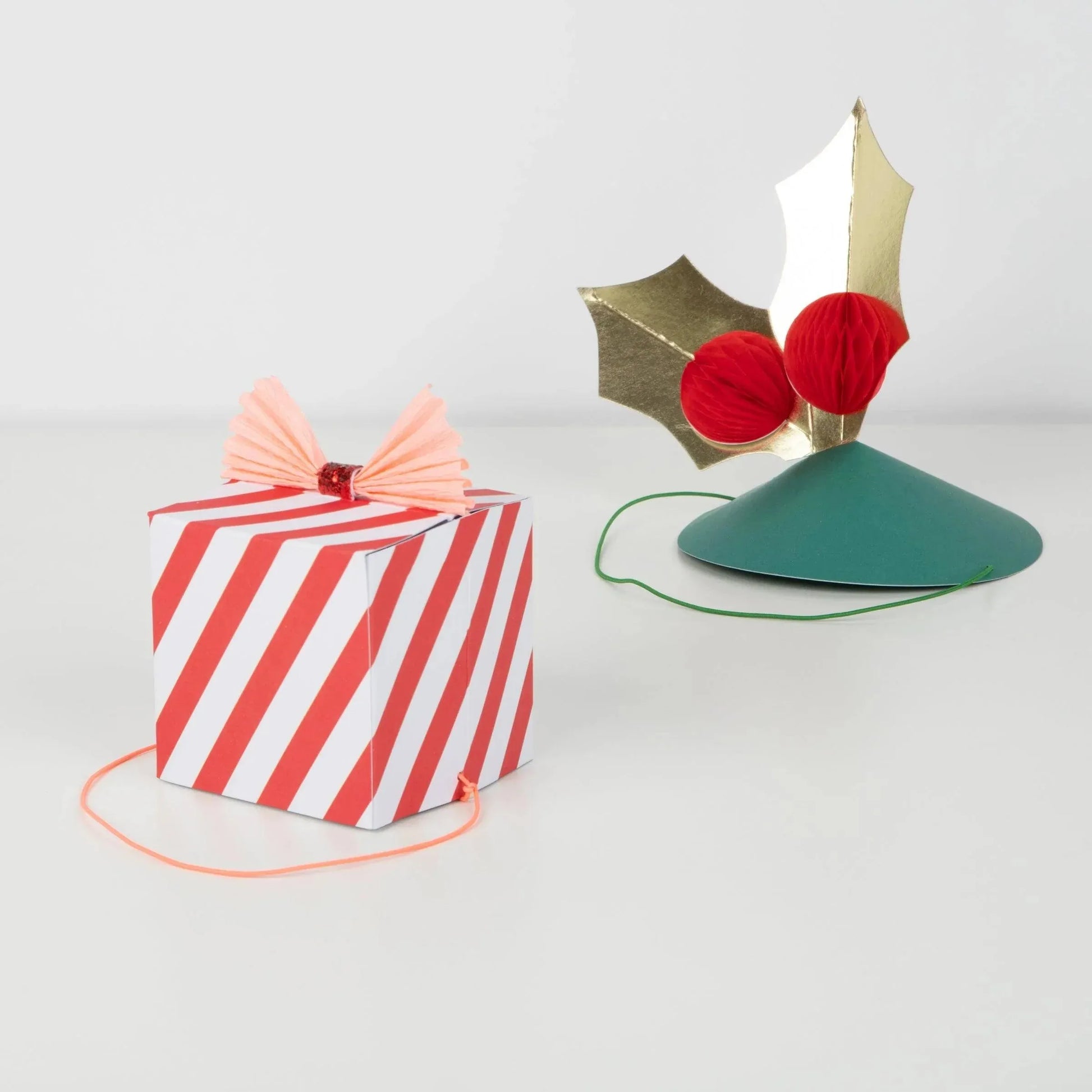 Gift hats feature red and white, and green and white, designs, topped with pink and red crepe paper bows with ECO glitter centres in red and platinum gold, with pink and green thin round elastic