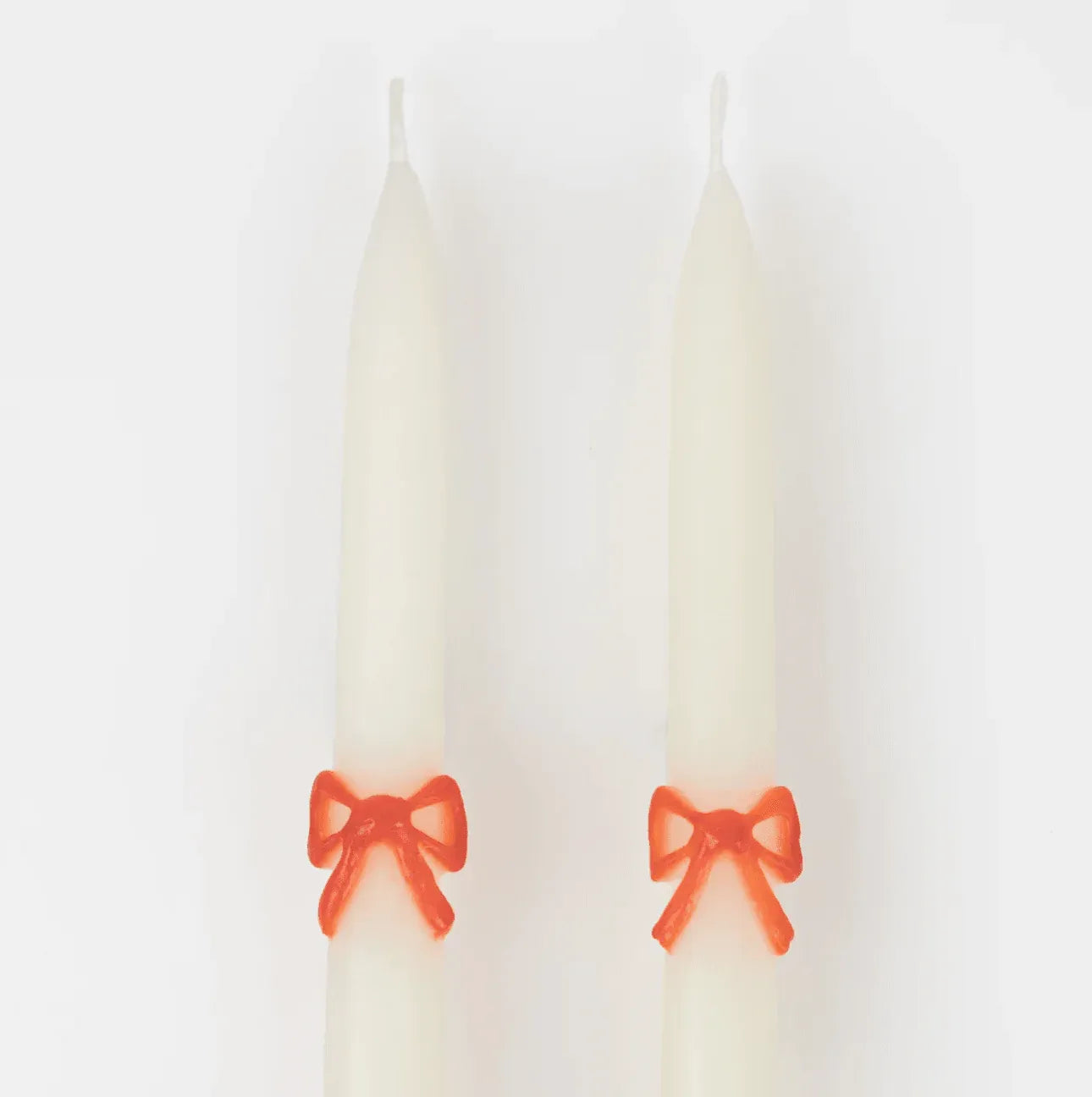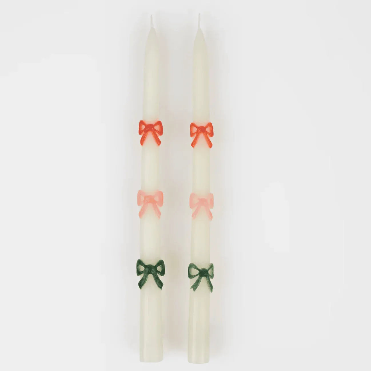 Ivory candles with hand-painted wax bow relief design in red, pink and green