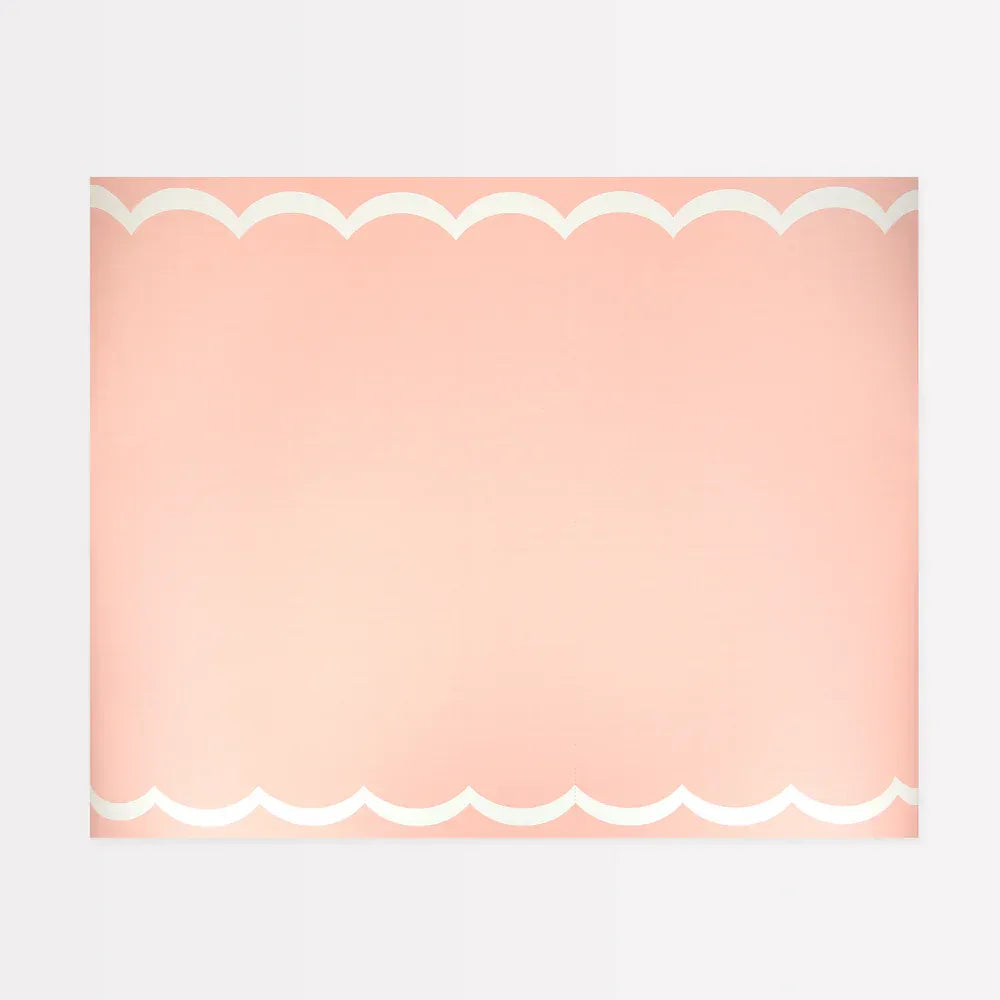 Our paper table runner is the ultimate multi-tasker for modern entertaining. Perfect for layering, it adds a pop of color to your celebration, and also helps protect your table or tablecloth. Beyond the dining table, drape it over buffet tables, coffee tables, or sideboards, for an extra dose of sophistication and style. The soft shade of pink, with a white scalloped edge, is ideal for birthday parties, baby showers, princess parties, fairy parties and unicorn parties.